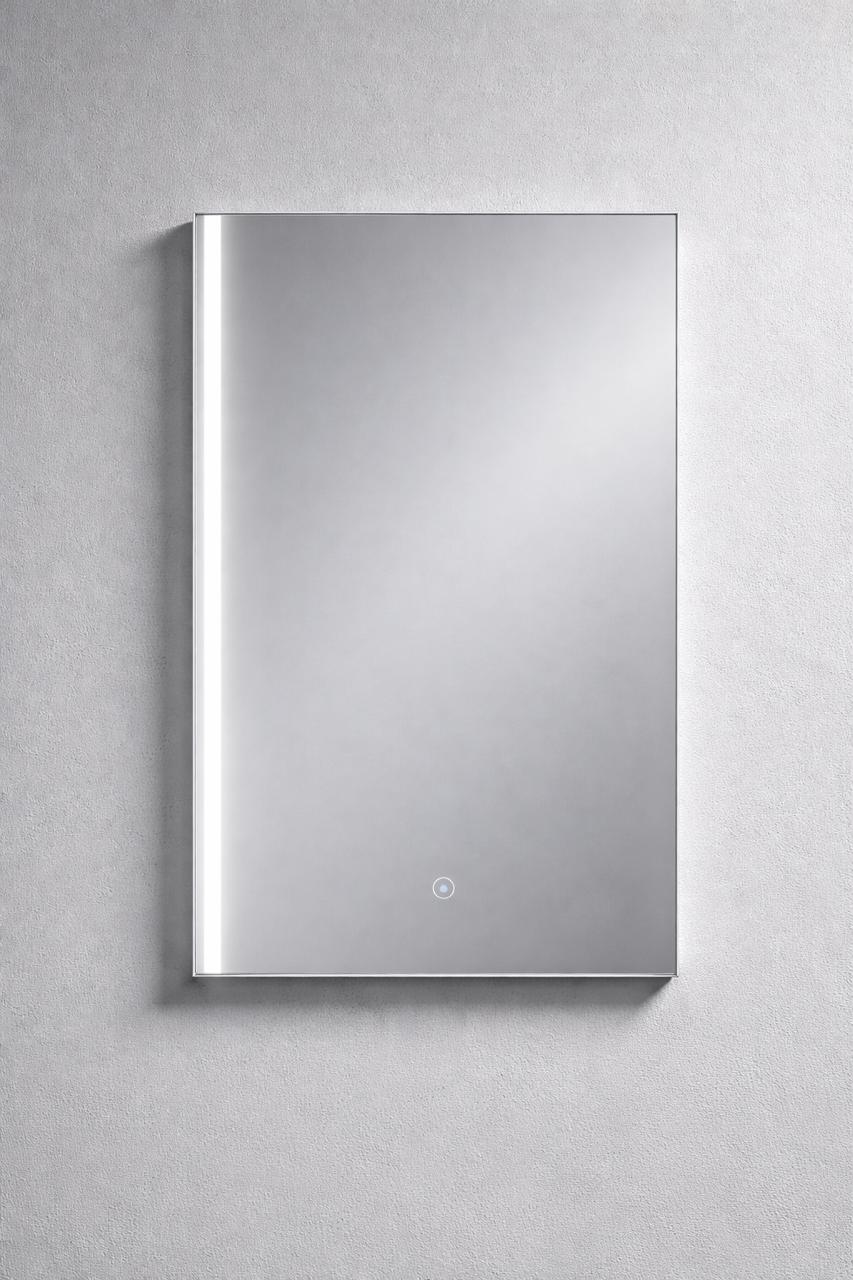Espejo 4mm horizontal con cantos pulidos, cenefa en la parte frontal con botón touch.